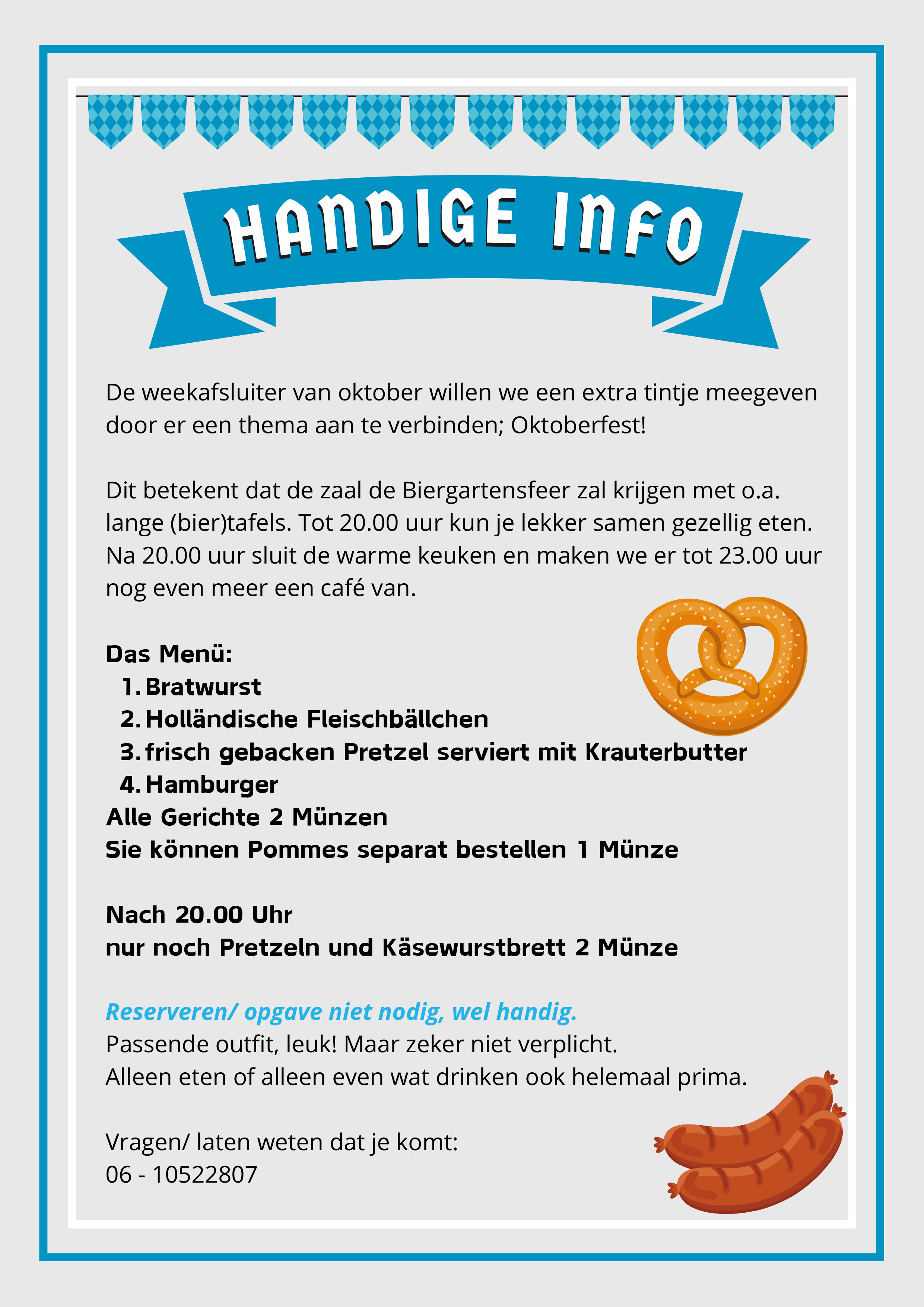 Jawel! Een echt Oktoberfest in ons Dorpshuis, het is natuurlijk leuk als je verkleed komt (niet verplicht natuurlijk).
